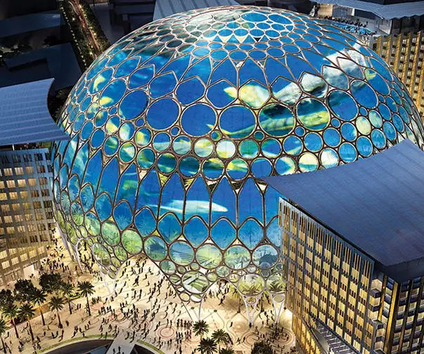Al Wasl Plaza’s trellis design was inspired by an ancient golden ring found in the Saruq Al Hadid site by Sheikh Mohammed bin Rashid, Vice President and Ruler of Dubai. It also reflects the intertwined logo of the Expo 2020. The moulded steel dome is 130-metre wide, 67-metre tall and weighs more than 500 tonnes.