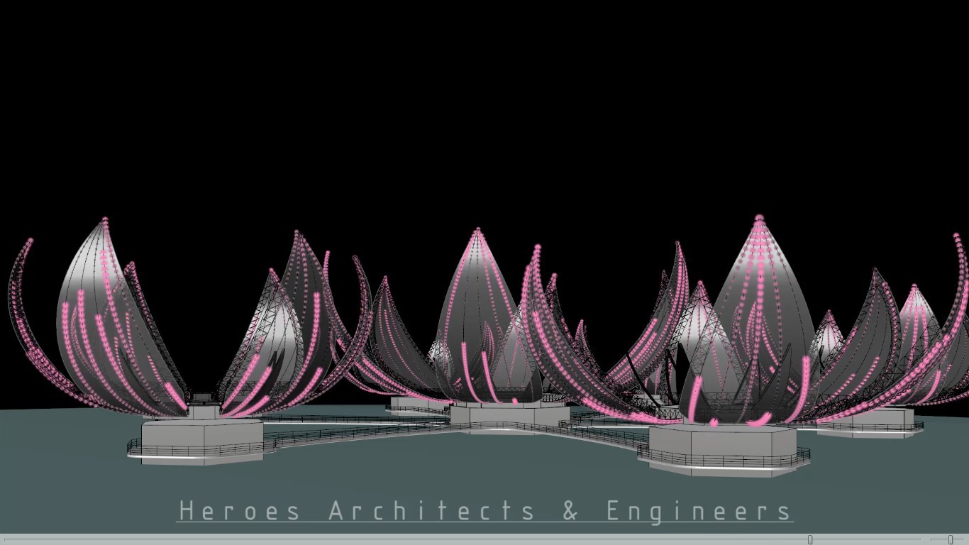 Fast proposal for a Resort project.We minimized the weight of structure and balance it with the buoyancy. The mechanical part was simulated. Both day view and night view were considered to be attractive.Each leaf is designed for fishing in the platform, when winter is coming(GOT), the lotus are able to close the leaves and keep the people warm.