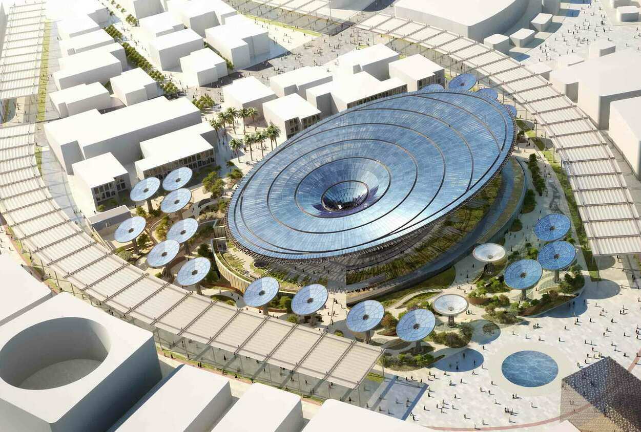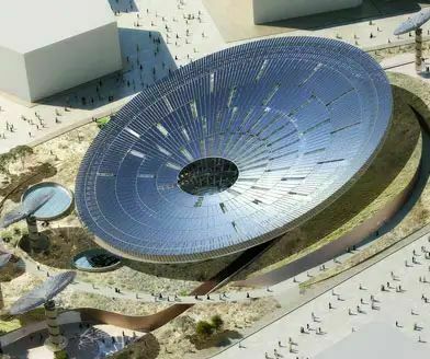 The pavilion is one of three at the expo, presenting the opportunity to deliver an aspirational message about the natural world, ecology, and technology to a global audience. Drawing inspiration from complex natural processes like photosynthesis, the dynamic form of the pavilion is in service to its function, capturing energy from sunlight and fresh water from humid air.