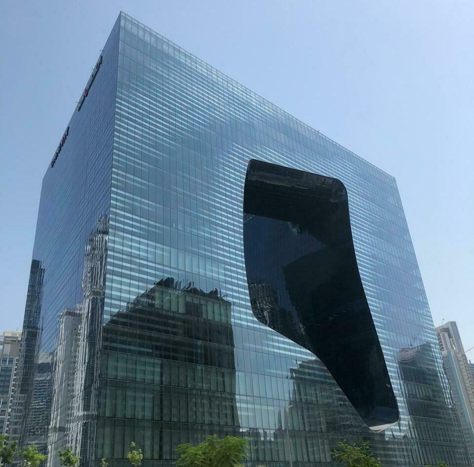 Two concrete tower blocks, connected by steel bridge with composite slabs, and steel atrium roof Flat facades: Fully glazed unitized curtain walling, glass with mirror pattern. Typical unit module: 3.9 x 1.5 m Framing members are silver color. Void facades: Fully unitized curtain walling (walls) and cassette type system (soffits, skylights). Flat, single curved, double curved, cold bent glazing. Glass is blue tinted, laminated, performance coated. Framing members straight and curved, dark blue coated. Ground floor facades: GRP composite mullions. Bulkheads: the slab- CW interface at ceiling is provided by complex shaped GRP composite element External lighting: Programmable LED system integrated to joints at void area at approx. 1.5 x 1.95 m grid Maintenance and cleaning access: Rope access hooks and rails integrated